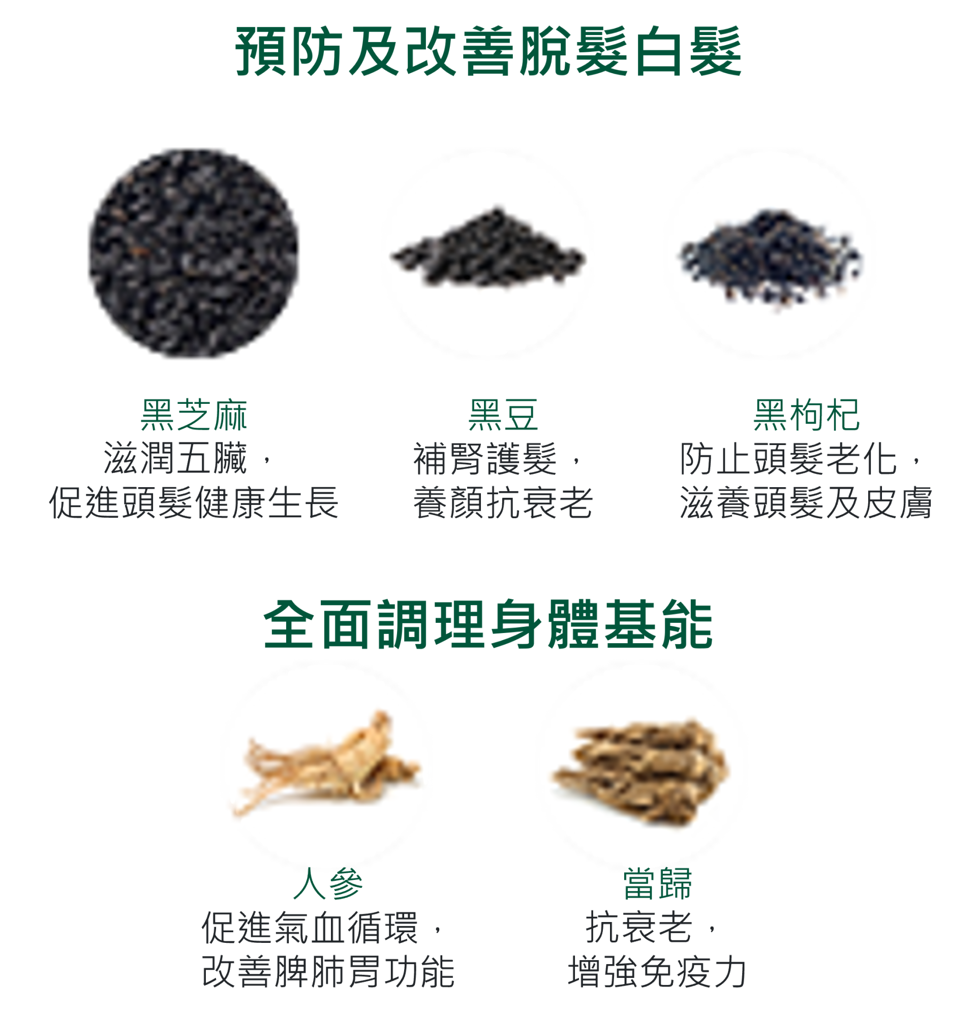 黑芝麻,黑枸杞, 黑豆, 人參, 當歸